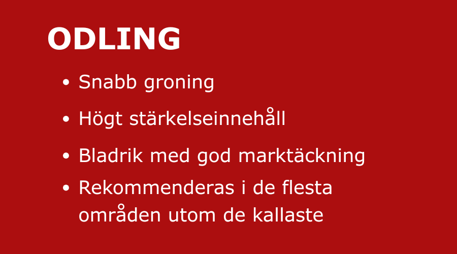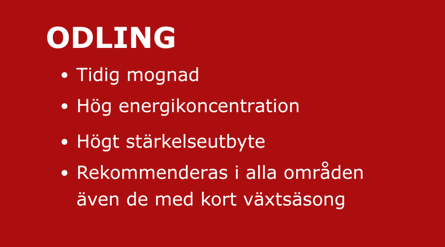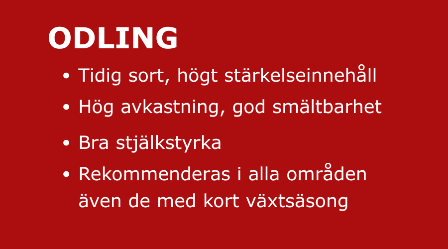 Trots den korta utvecklingstiden ger den hög avkastning, högt stärkelseinnehåll och god smältbarhet.