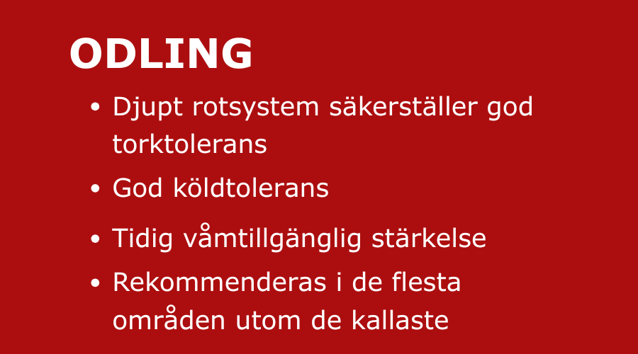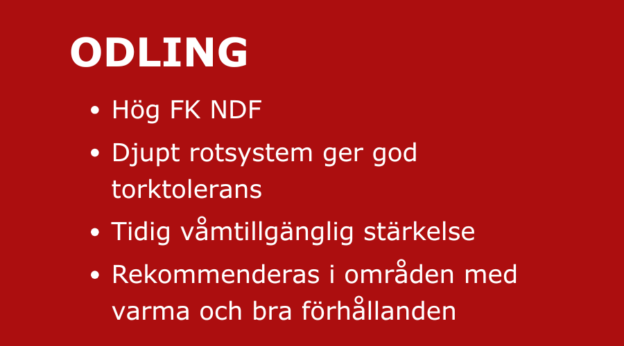 Sorten har en snabb etablering på våren och passar bra i områden där man vill ha maximalt fodervärde kombinerat med ett robust tillväxtsätt.